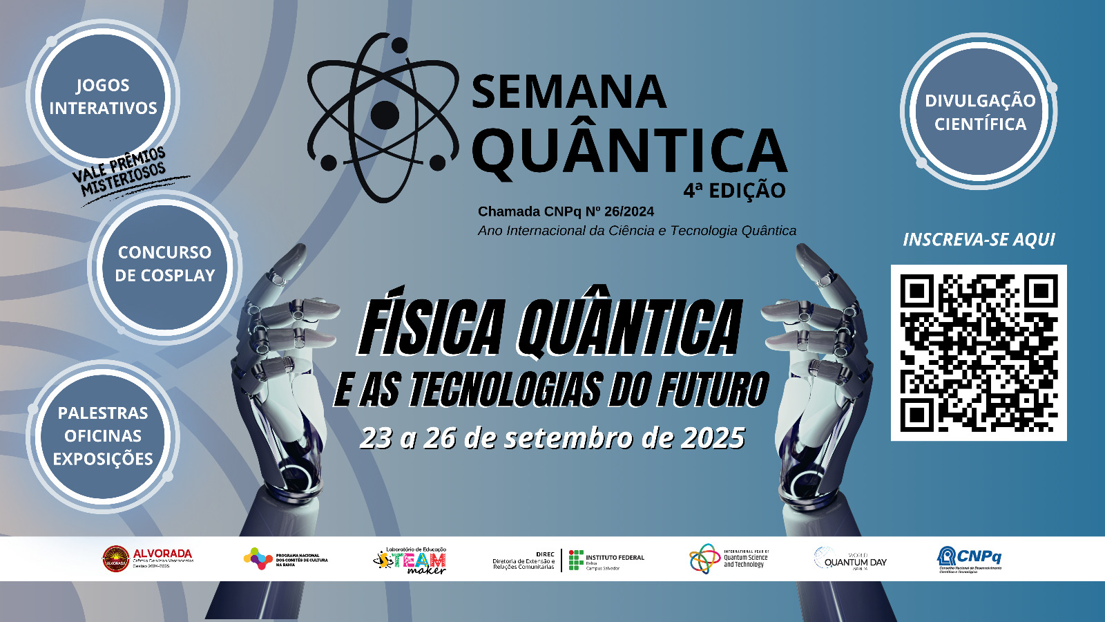 A atual edição da Semana Quântica vai ter como tema “Física quântica e as tecnologias do futuro” e vai celebrar 2025 como o Ano Internacional da Ciência e Tecnologia Quântica, de acordo com a definição da Organização das Nações Unidas para a Educação, a Ciência e a Cultura (Unesco). O projeto desse evento foi selecionado na Chamada 26 do Conselho Nacional de Desenvolvimento Científico e Tecnológico (CNPq).